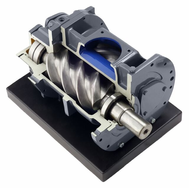 Les compresseurs sans huile, à vis utilisent deux rotors hélicoïdaux qui s'engrènent pour comprimer l'air. L'air est piégé entre les rotors et comprimé progressivement à mesure qu'il se déplace vers la sortie.