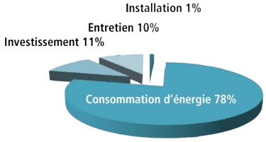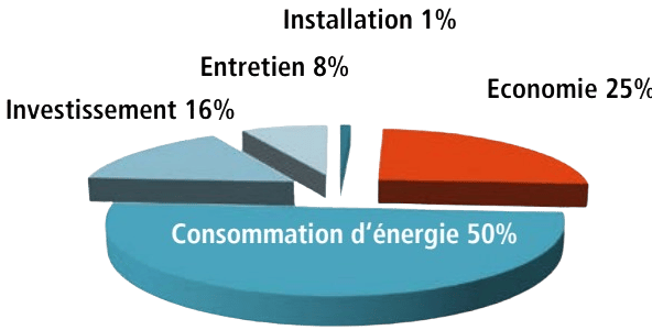 Après 5 années de fonctionnement, les dépenses énergétiques représentent 78% des coûts globaux d‘un compresseur conventionnel.